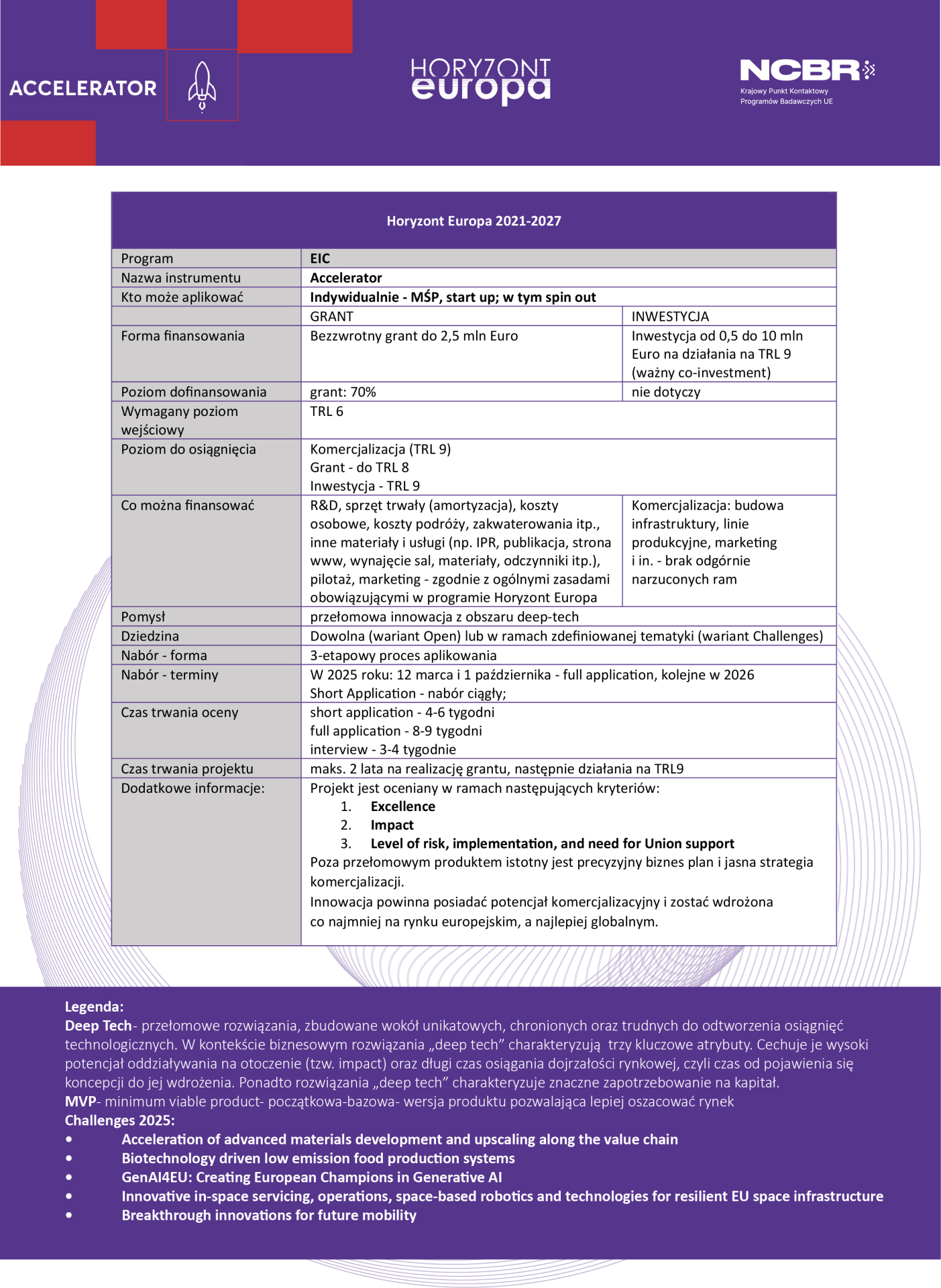 - Accelerator Challenge: Wspierane są startupy i MŚP, które opracowują rozwiązania w ramach wskazanych strategicznych technologii. W 2026 r. takimi wyzwaniami są: