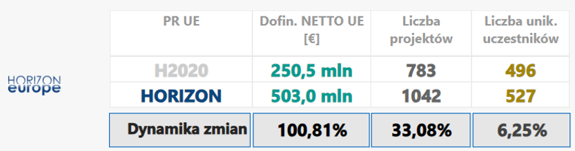 To 100-procentowy wzrost wartości dofinansowania netto w porównaniu z analogicznym okresem Horyzontu 2020 (250,5 mln euro) oraz wzrost liczby realizowanych projektów z polskim udziałem o 33% (783 projekty w H2020). Przekłada się to również na znaczny wzrost średniego dofinansowania na projekt – z 320 tys. euro w Horyzoncie 2020 do 483 tys. euro w Horyzoncie Europa.