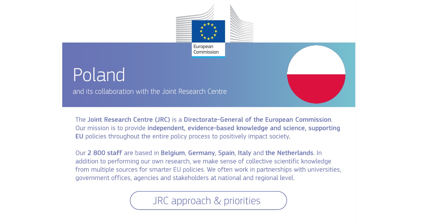 Wspólne Centrum Badawcze Komisji Europejskiej (Joint Research Centre – JRC) opublikowało nowe broszury informacyjne. Pierwsza z nich w całości poświęcona jest działalności JRC związanej z Polską, druga natomiast dotyczy ogólnej działalności Centrum.