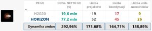 W programie Horyzont Europa polskim beneficjentom (735 podmiotów) przyznano dotychczas ponad 770 mln euro na realizację 1459 projektów. To 220% wartości dofinansowania netto w porównaniu z analogicznym okresem Horyzontu 2020 (351,4 mln euro) oraz wzrost liczby realizowanych projektów z polskim udziałem o ponad 31% (1111 projektów w H2020).
