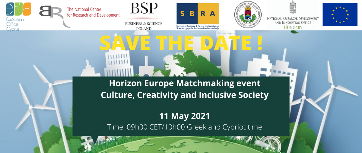 11 maja 2021 r. odbędzie się wydarzenie pt.: Horizon Europe Matchmaking event/ Culture, Creativity and Inclusive Society poświęcone kojarzeniu partnerów z Polski, Słowenii, Węgier, Grecji i Cypru zainteresowanych udziałem w konkursach organizowanych w ramach klastra 2: kultura, kreatywność i społeczeństwo integracyjne w Horyzoncie Europa.