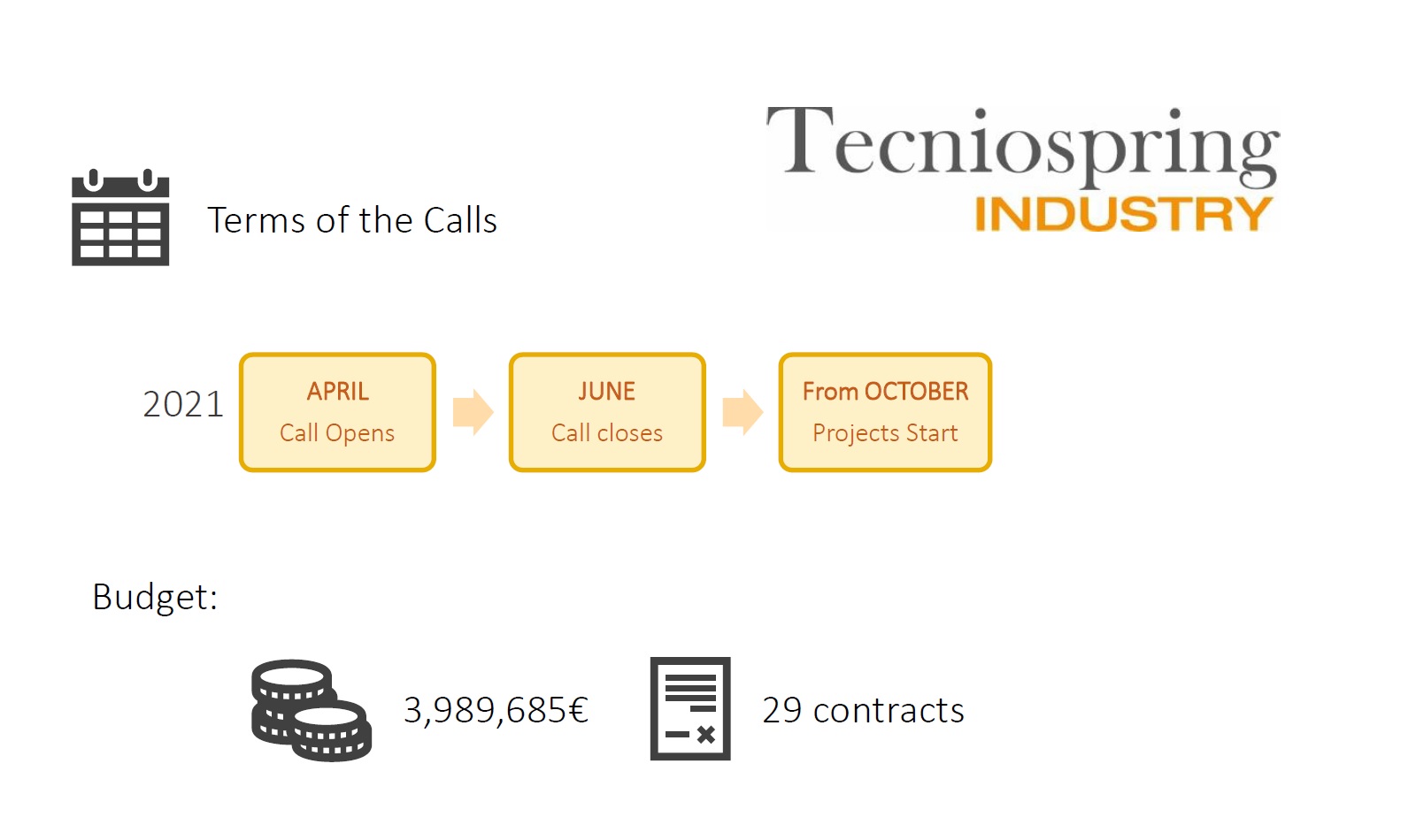 Dzięki programowi Tecniospring Industry, naukowcy z całego świata mają możliwość pracy w wybranej firmie katalońskiej przez okres 2 lat (Incoming fellowship), lub w wybranych przez siebie centrach badawczych lub działach B+R prywatnych firm na całym świecie w ciągu pierwszego roku trwania programu, a w drugim roku w firmach lub centrach technologicznych w regionie Katalonii (Outgoing + Return fellowship).
