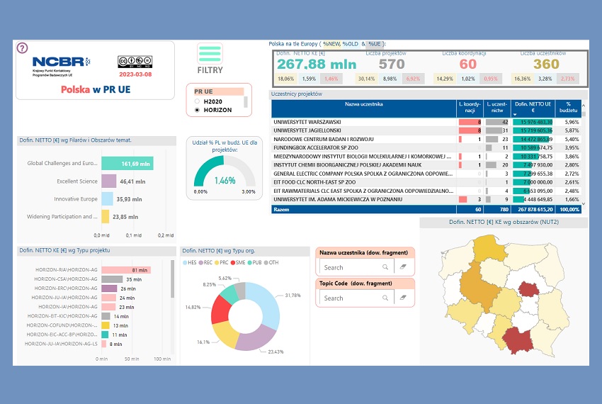 Pełne podsumowania uczestnictwa w PR Horyzont Europa są dostępne w naszych 4 dashboardach publikowanych na stronach KPK.