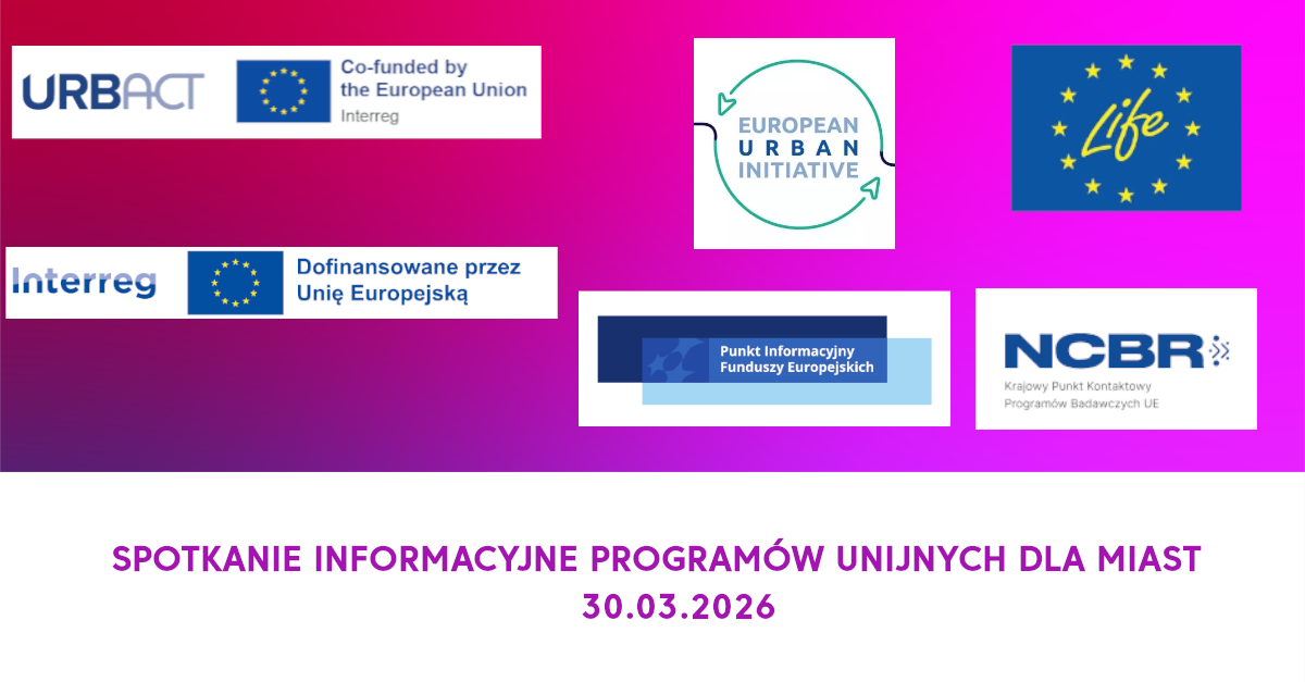 Zapraszamy na spotkanie informacyjne online dnia 30 marca 2026 o godz. 10:00, na którym przedstawimy propozycje wielu programów i inicjatyw unijnych dla samorządów miejskich, m.in. Horyzont Europa, Interreg, URBACT, EUI, LIFE, fundusze strukturalne.