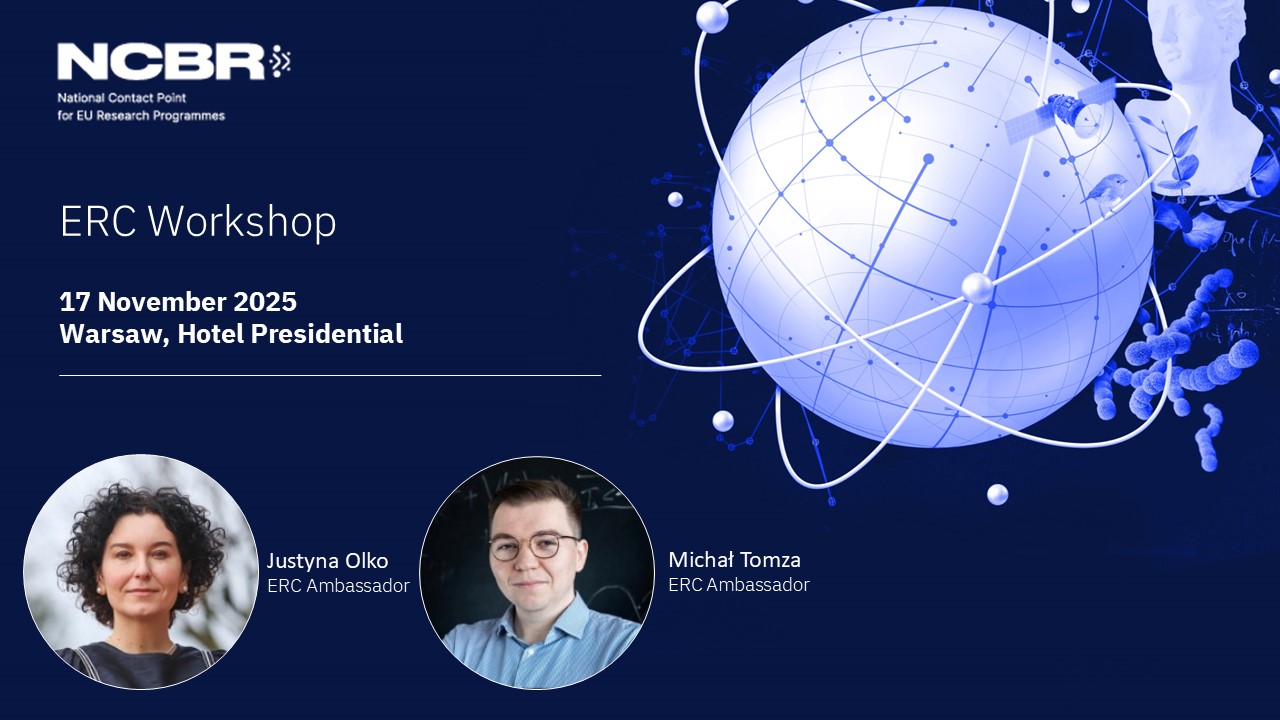 The National Contact Point at NCBR, together with the ERC Ambassadors – Prof. Justyna Olko and Prof. Michał Tomza – invites you to an ERC workshop to be held on 17 November 2025, 10:00–17:00, in Warsaw at the Presidential Hotel, Al. Jerozolimskie 65/79. The event is intended exclusively for researchers planning to submit an ERC grant application.