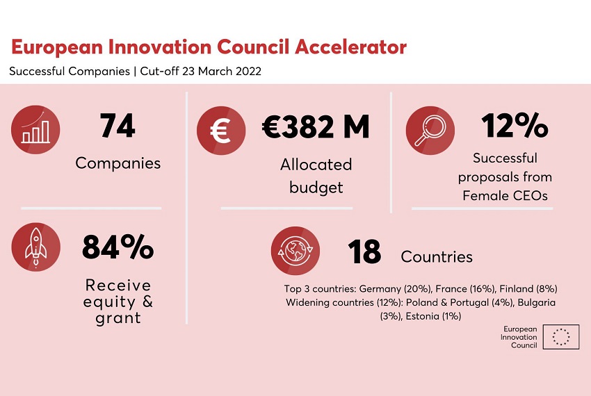 Komisja ogłosiła wyniki pierwszego w 2022 roku cut-offu EIC Acceleratora. Wśród wybranych 74 innowacyjnych firm są trzy polskie spółki. Wybrane przedsiębiorstwa otrzymają w sumie 382 mln euro dofinansowania w formie grantów i inwestycji.