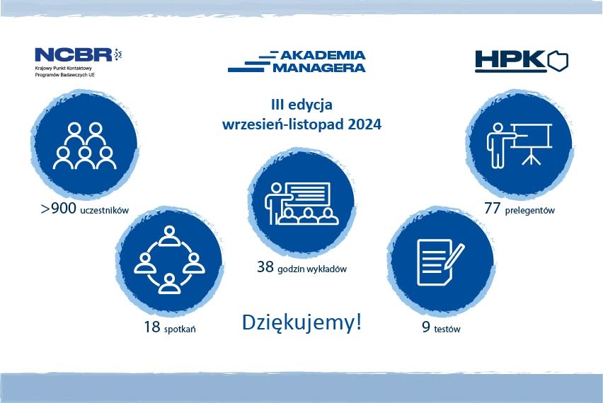 Blisko 80 ekspertów z Krajowego Punktu Kontaktowego, sieci Horyzontalnych Punktów Kontaktowych spotkało się z uczestnikami dziewięciu modułów tematycznych i dziewięciu modułów uzupełniających tegorocznej Akademii Managera. W trakcie 38 godzin wykładów gościliśmy ponad 900 uczestników – w ogromnej większości łączących się z nami regularnie, co tydzień.