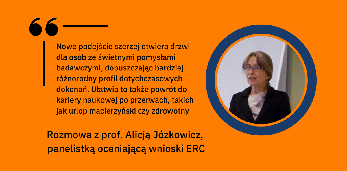 – Nowe podejście szerzej otwiera drzwi dla osób ze świetnymi pomysłami badawczymi, dopuszczając bardziej różnorodny profil dotychczasowych dokonań. Ułatwia to także powrót do kariery naukowej po przerwach, takich jak urlop macierzyński czy zdrowotny. Ważne jest, by ocena skupiała się na jakości projektu, z odniesieniem do jakości dorobku potwierdzającej kwalifikacje autora do poprowadzenia zaplanowanych badań – wyjaśnia prof. Alicja Józkowicz, odnosząc się do zmian wprowadzonych od 2024 r. do procesu oceny wniosków projektowych ERC.